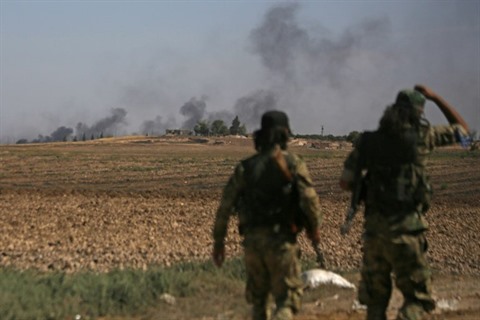 | Des supplétifs syriens de l'Armée turque, qui a lancé une offensive contre les secteurs kurdes dans le Nord de la Syrie, regardent des nuages de fumée noire au dessus de Tal Abyad, le 12 octobre. |