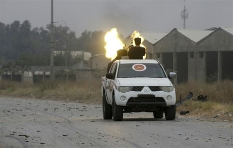 | Des combattants pro-gouvernementaux tirent contre des positions de troupes du maréchal Khalifa Haftar le 21 mai au sud de Tripoli. |