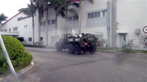 Le même jour 17 février, la 3e zone militaire a mobilisé deux camions pulvérisateurs spécialisés, une tonne de Cloramin B et dix officiers et soldats pour pulvériser du désinfectant à de nombreux endroits dans le district de Câm Giàng.