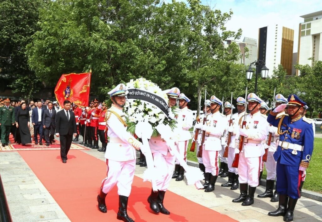 | Cérémonie d'offrande de fleurs et d'encens pour commémorer les héros tombés au Monument de l'amitié Vietnam - Cambodge, à Phnom Penh. |