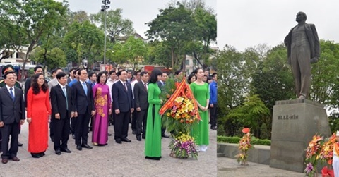 | Des représentants des autorités de Hanoi devant la statue de Lénine, le 22 avril dans la capitale. |
