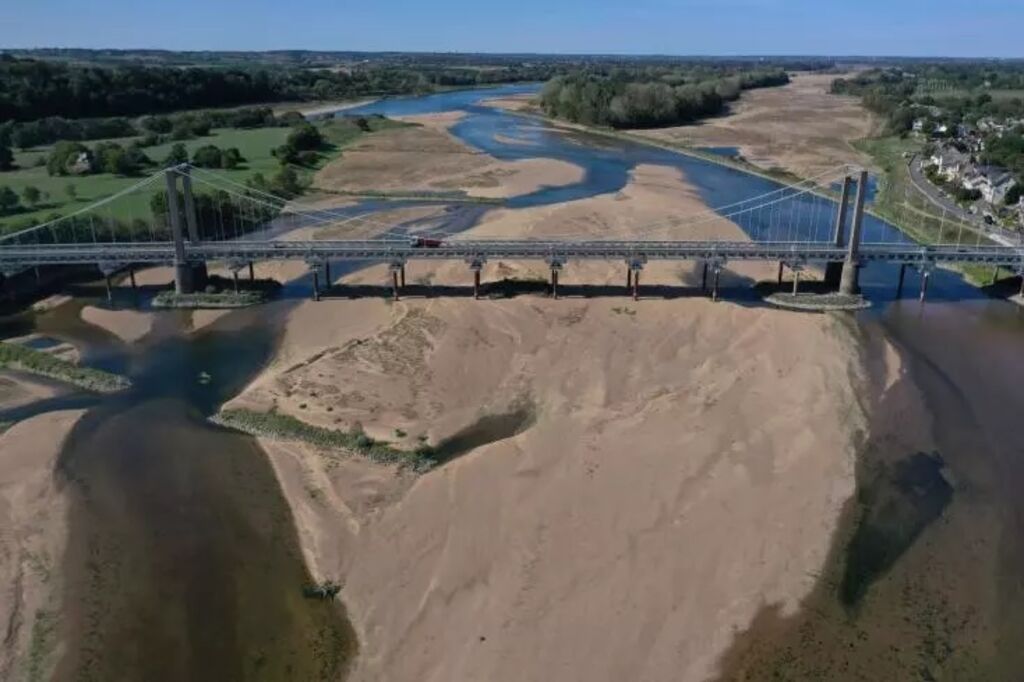 | Le lit de la Loire après la sécheresse exceptionnelle de l'été 2022, le 20 septembre 2022 à Loireauxence, dans l'Ouest de la France. |
