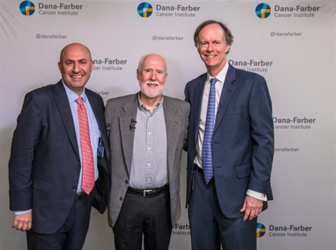 | William Kaelin (droite) et le Dr Toni Choueiri (gauche) avec le patient Shaun Tierney à Boston, le 11 novembre. |