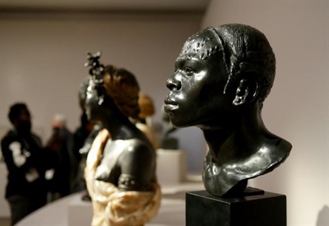 | Un buste en bronze +Souvenir de voyage de l'expedition Stanley+ de Herbert Ward, présenté à la presse pour l'exposition "Le modèle noir de Géricault à Matisse", au musée d'Orsay à Paris, le 25 mars. |