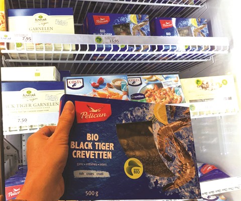 | Le prix d’une boîte de crevettes biologiques Black Tiger surgelées du Vietnam (500 gr) est de 15,95 CHF (environ 408.000 dôngs). |