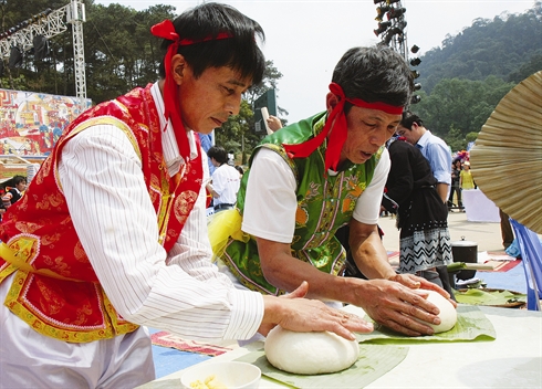 | Concours de préparation du banh dày lors de la Fête du temple des rois fondateurs Hùng à Phu Tho. |