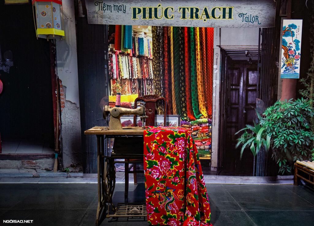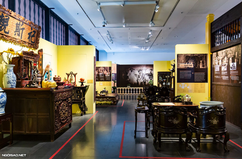 L’entrée de l’exposition n’est autre qu’une reproduction de la porte d’un village ancien de Hanoï. Le visiteur entre ensuite dans le salon, le regard capté par un tableau transversal doré sur lequel sont gravés deux caractères chinois signifiant "Énergie paisible", ce qui traduit un vœu de concorde familiale. En bas, ce sont des objets représentatifs d’une famille aisée de l’époque: des meubles en bois précieux et incrustés de nacre, des objets de table… La salle d’à côté est la salle de culte, soit l’espace le plus sacré de la maison, où sont installés un porte-encens, un plateau d’offrandes, une paire de vases, un panneau tranversal et des sentences parallèles vieillis par le temps. L’espace rappelle la célèbre maison de couture Phuc Trach de Hanoï, avec des tissus multicolores, mais aussi une couverture décorée de motifs de paons et une machine à coudre du type de celles que l’on trouvait chez les Hanoïens aisés au siècle dernier…