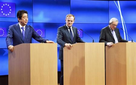 M. Abe était à Bruxelles pour rencontrer le président de la Commission européenne Jean-Claude Juncker et celui du Conseil européen Donald Tusk afin de soutenir l'accord de libre-échange que son pays négocie avec l'UE.