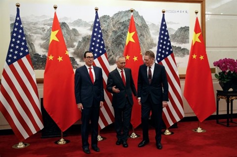 | Le vice-Premier ministre chinois Liu He avec le secrétaire américain au Trésor, Steven Mnuchin (gauche), et le représentant au Commerce, Robert Lighthizer (droite), posent pour les photographes avant leurs discussions, le 1er mai à Pékin. |