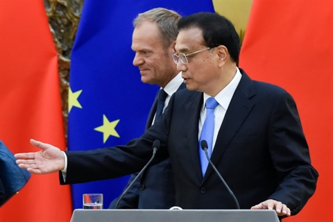 | Le Premier ministre chinois Li Keqiang (droite) et le président du Conseil européen Donald Tusk lors d'une conférence de presse commune, à Pékin le 16 juillet. |