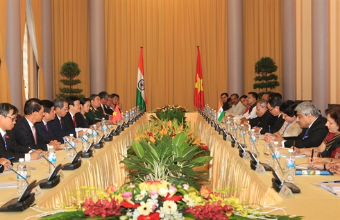 L'entretien entre les deux présidents vietnamien et indien s'est déroulé dans une atmosphère amicale et de confiance mutuelle. Les dirigeants se sont réjouis du développement de l'amitié traditionnelle et ont exprimé leur satisfaction devant les avancées de la coopération bilatérale, notamment depuis l'établissement du partenariat stratégique en 2007. L'Inde a réaffirmé qu'elle continuait de considérer le Vietnam comme un pilier de sa politique orientale. Le Vietnam a affirmé qu'il continuait d'appuyer la politique orientale de l'Inde et qu'il soutenait un rôle plus important de l'Inde au sein des forums régionaux et internationaux.