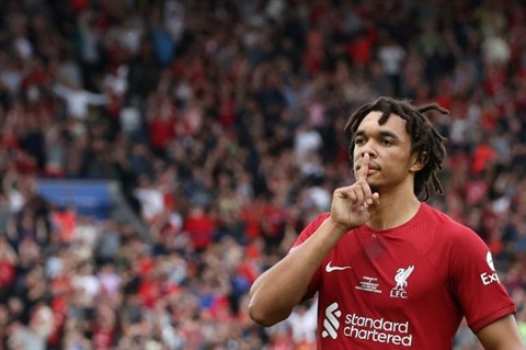 | Le défenseur de Liverpool Trent Alexander-Arnold vient d'ouvrir la marque contre Manchester City dans le Community Shield, le 30 juillet à Leicester. |