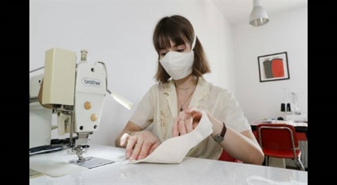| Capucine, élève d'une école de mode fabrique un masque à Paris, chez elle le 8 mai 2020. |