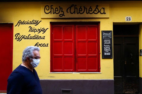 | Un passant devant la devanture fermée d'un restaurant à Nice, le 9 mai 2020. |