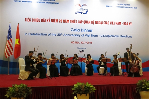 | Un banquet en l’honneur du 20e anniversaire de l’établissement des relations diplomatiques Vietnam - États-Unis, le 30 juillet à Hanoi. |
