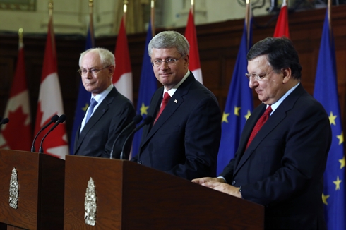 | De gauche à droite : le président du Conseil européen Herman Van Rompuy, le Premier ministre canadien Stephen Harper et le président de la Commission européenne Jose Manuel Barroso, lors d'une conférence de presse à Toronto le 26 septembre. |