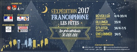 Inspiré par de célèbres fêtes de pays francophones, l'«Expédition francophone» 2017 a pour objet d’encourager, chez les élèves et les étudiants des lycées et universités francophones du Nord du Vietnam, les talents cachés et l’amour du français, la langue la plus romantique du monde. Une bonne opportunité pour eux d’enrichir leurs connaissances sur la culture des pays francophones, notamment les fêtes.