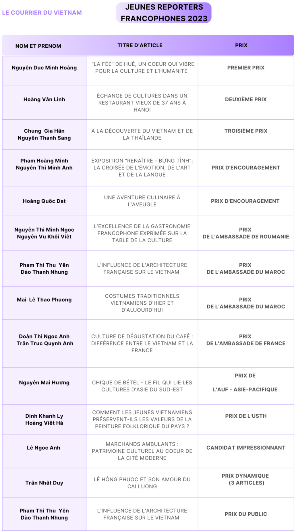 Nguyên Duc Minh Hoàng (23 ans, Thua Thiên Huê) a reçu le Premier prix du concours "Jeunes Reporters Francophones 2023" organisé par Le Courrier du Vietnam, avec le soutien de la Représentation régionale Asie-Pacifique de l'Organisation internationale de la Francophonie (REPAP-OIF) et du Groupe des ambassades, délégations et institutions francophones (GADIF) à Hanoï.