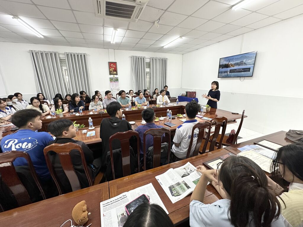 | La rédactrice en chef du Courrier du Vietnam Nguyên Hông Nga échange avec des étudiants du Département de langues étrangères de l’Université de Cân Tho, le 11 janvier dans la ville éponyme. |