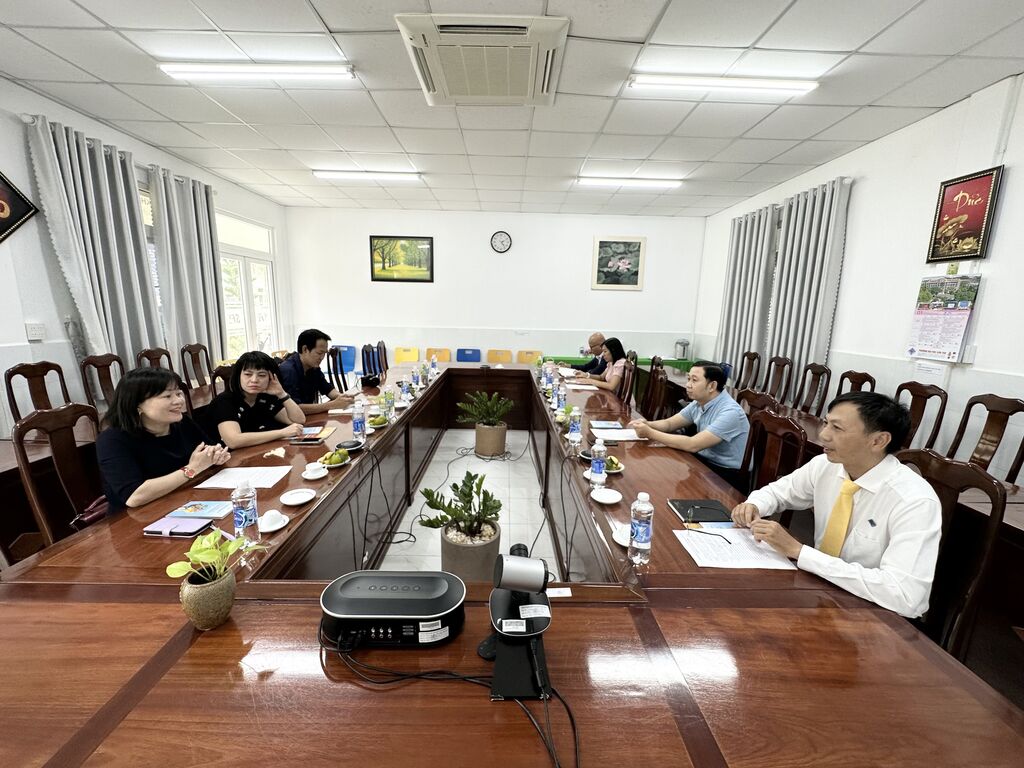 | Le Docteur Diêp Kiên Vu (chemise blanche), vice-doyen du Département de langues étrangères de l’Université de Cân Tho et des enseignants de français de l’Université de Cân Tho travaillent avec l'équipe du Courrier du Vietnam. |