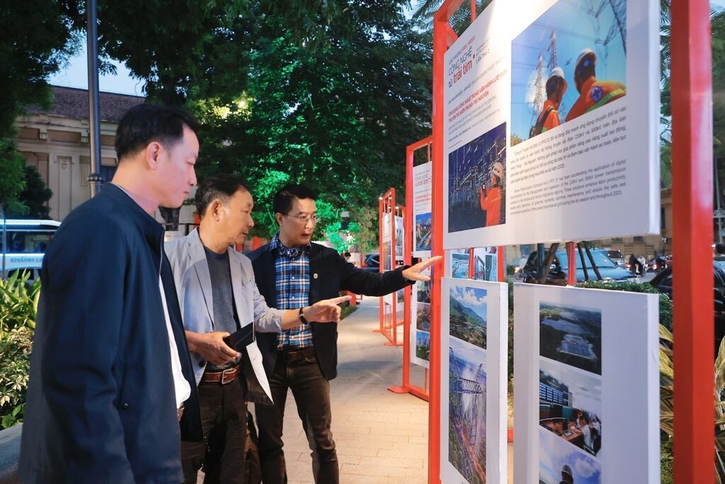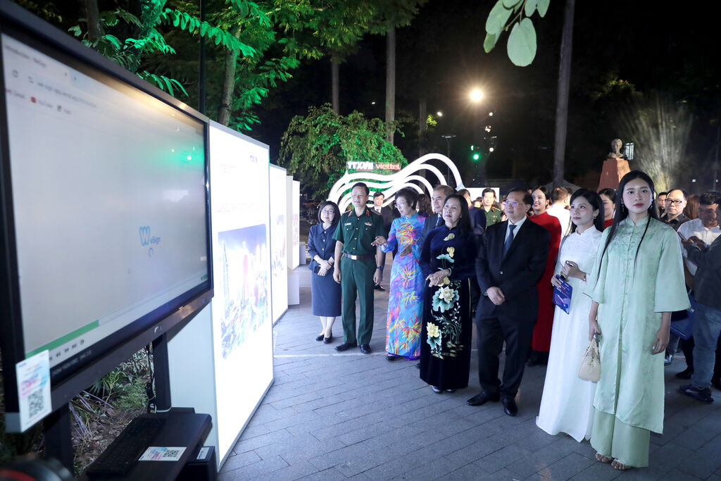 | L’exposition des œuvres photographiques du concours "La technologie avec le cœur" au jardin de fleurs Tao Dàn. Photo : VNA/CVN |