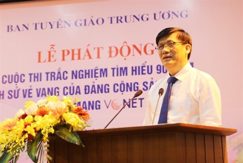 | Nguyên Thanh Long, chef adjoint du Comité central de propagande et d’éducation du PCV, aussi chef du comité d'organisation du concours "Étudier les 90 ans d’histoire glorieuse du Parti communiste du Vietnam" s'exprime lors de la cérémonie de lancement du concours. |