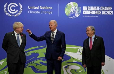 | Boris Johnson, Joe Biden et Antonio Guterres à la COP26 à Glasgow, le 1er novembre. |