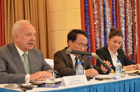 | L’ambassadeur russe Konstantin Vnukov (gauche), lors de la conférence de presse donnée le 28 décembre à Hanoi. |