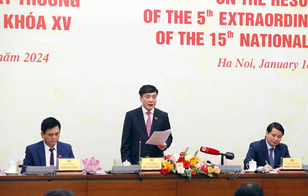 | Le président du Bureau de l’AN, Bùi Van Cuong (debout), préside la conférence de presse sur les résultats de la 5e session extraordinaire de l'AN (XVe législature), le 18 janvier. |