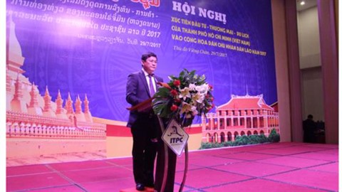 | Le vice-président du Comité populaire de Hô Chi Minh-Ville, Huynh Cach Mang, prend la parole lors de la conférence, le 29 juillet à Vientiane (Laos) |