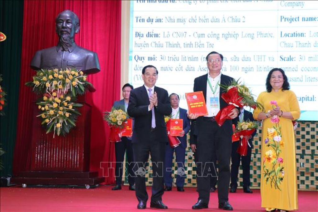 Lors de la conférence, le comité populaire de la province de Bên Tre a organisé une cérémonie de signature d'accords de coopération stratégique avec plus de 20 investisseurs et a remis des décisions de politiques d'investissement, ainsi que des certificats d'enregistrement pour six projets à six investisseurs, représentant un capital total de 7.985,53 milliards de dôngs.