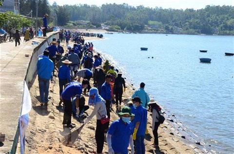| Des jeunes participent au nettoyage d'une plage |