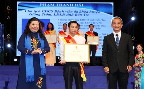 | La vice-présidente de l'Assemblée nationale, Tong Thi Phong, et le président de la Confédération générale du Travail du Vietnam, Dang Ngoc Tùng (droite) lors de la cérémonie de remise des satisfecits aux présidents de syndicat exemplaires, le 27 juillet à Hanoi. Photo : Lâm Khanh/VNA/CVN |