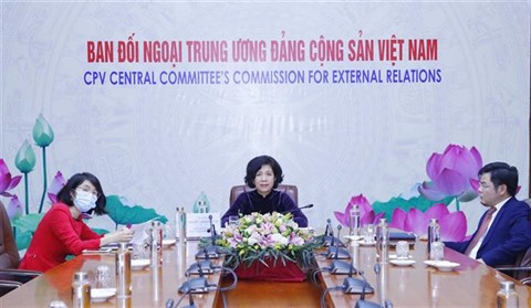 | La vice-présidente de la Commission des relations extérieures du Comité central du Parti communiste du Vietnam, Nguyên Thi Hoàng Vân (centre), lors de la conférence en ligne, le 24 janvier à Hanoï. |