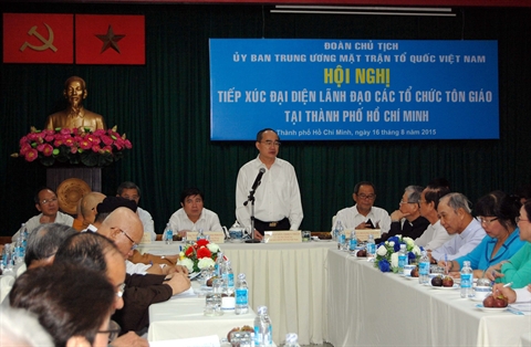 | Le président du FPV, Nguyên Thiên Nhân (au micro), à la Conférence entre le FPV et des religieux, le 16 août à Hô Chi Minh-Ville. |