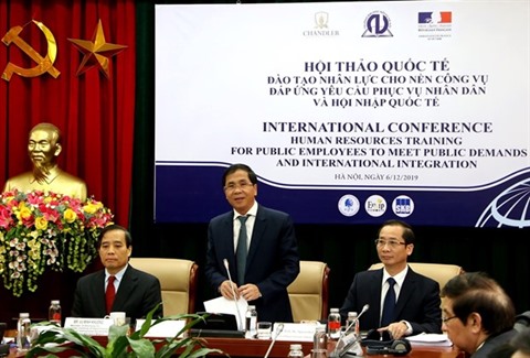 | Le vice-ministre de l'Intérieur, Trìêu Van Cuong (debout), à la conférence internationale sur la formation des ressources humaines pour l'intégration. |