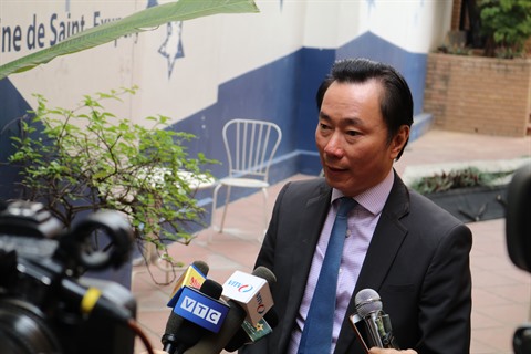 | L’ambassadeur Pham Sanh Châu, assistant du ministre des Affaires étrangères et envoyé spécial du Premier ministre chargé des affaires de l'UNESCO, discute avec des journalistes. |