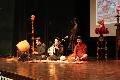 | Le chant +châu van+ (chant rituel de médiumnité) interprété par des musiciens, lors de la conférence. |