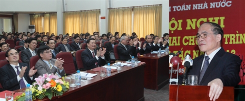 | Le président de l'AN, Nguyên Sinh Hùng, lors d'une vidéo-conférence sur la réalisation des tâches de l'Audit d'État en 2013, le 5 février à Hanoi |