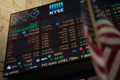 | Un tableau d'indices boursiers, le 24 mai 2017, à la Bourse de New York. |