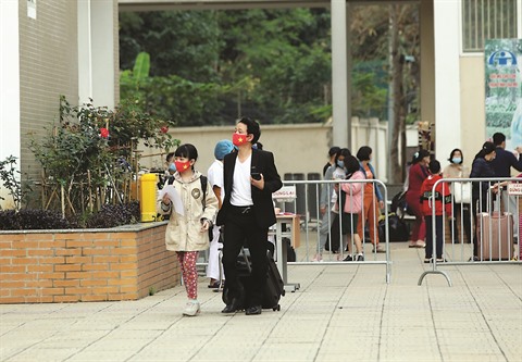 | Un père venu chercher sa fille, le 14 février 2021, après ses 14 jours dans la zone de quarantaine de l’École primaire de Xuân Phuong à Hanoï. |