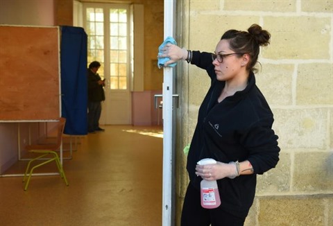 | Désinfection d'un bureau de vote pendant la journée du premier tour des municipales, le 15 mars. |