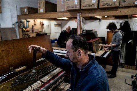 | Un atelier à Lyon, le 14 avril, où un piano est accordé avant d'être expédié. |