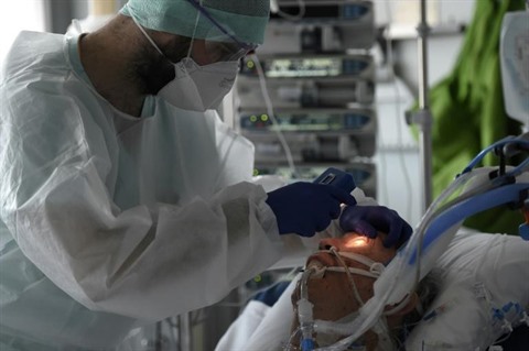 | Un médecin s'occupe d'un patient atteint du coronavirus dans l'unité de soins intensifs de l'hôpital universitaire de Strasbourg, le 22 octobre. |