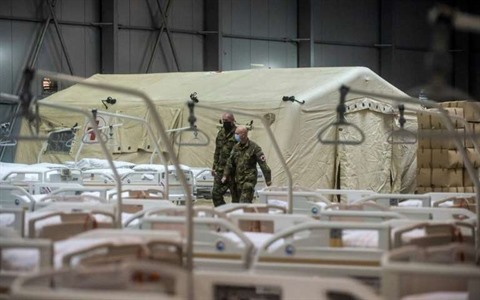 | Des soldats installent un hôpital de campagne de 500 lits pour les malades du COVID-19 à Prague, le 22 octobre. |