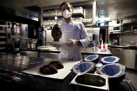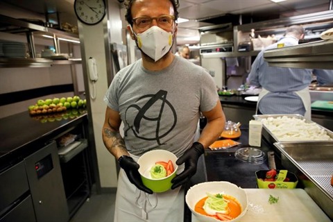 Petits légumes croquants relevés à l'harissa, de l'ail et des raisins pour accompagner l'agneau : "un plat du jour qu'on aurait fait au déjeuner au restaurant Le Cinq" dont il est chef, déclare Christian Le Squer. "Il faut que ce soit généreux", commente-t-il en disposant des tranches d'agneaux dans la barquette. "Il peut être mangé toute la journée, à partir de midi mais jusqu'à minuit." L'Italien Simone Zanoni, chef du George, une étoile Michelin, veut faire souffler le vent de la Méditerranée chez les soignants exténués par des semaines de lutte contre l'épidémie.
