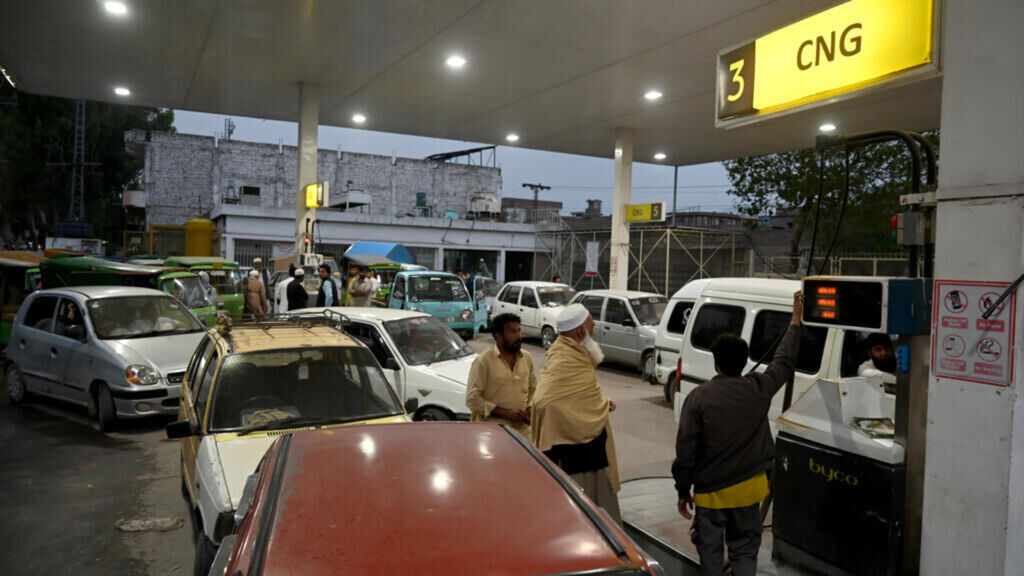 | Des automobilistes attendent pour faire le plein d'essence dans une station-service à Peshawar, le 25 mars au Pakistan. |