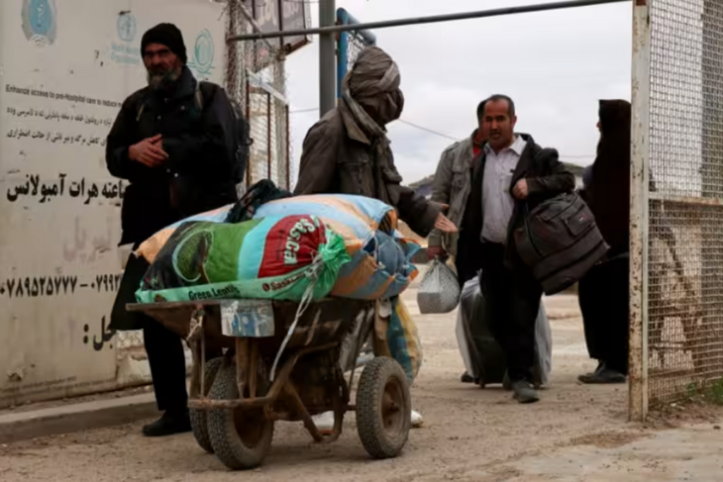 | Des ressortissants afghans arrivent avec leurs effets personnels au poste-frontière d’Islam Qala, entre l’Afghanistan et l’Iran, dans la province de Herat Province, le 10 mars 2026, après leur arrivée en provenance d’Iran dans le contexte du conflit au Moyen-Orient. |