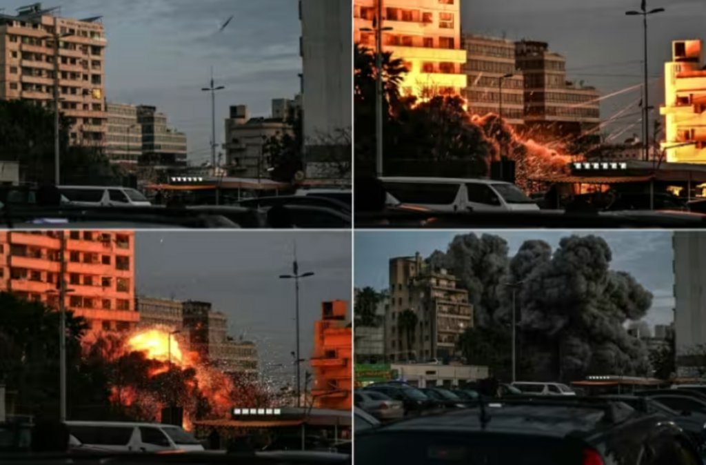 | Ce montage de photos montre une frappe aérienne israélienne ciblant un bâtiment du quartier Bashoura de Beyrouth tôt le 18 mars. |