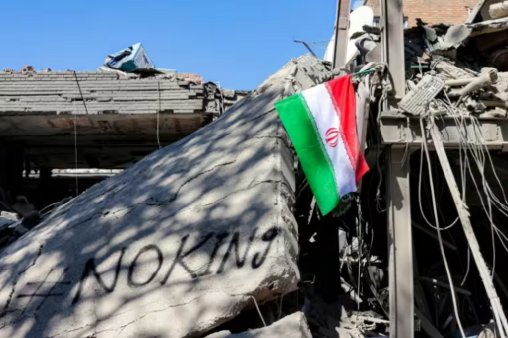 | Un drapeau iranien a été placé sur les ruines d'un bâtiment détruit par une frappe à l'Université de technologie de Téhéran, le 7 avril. |